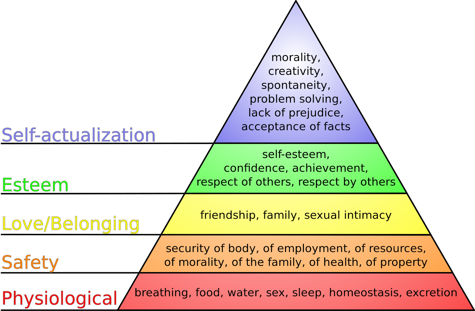 Maslow believed that people needed to reach certain needs in order to fulfil other needs. Maslow categorised these needs into 5 categories: Physiological, safety, love/belonging, esteem, and finally self-actualisation. He then displayed these needs onto a pyramid in order to show which needs need to be fulfilled in order to fulfil the next needs, for example, safety needs need to be completed before one can move on to love/belonging needs. Over a person's life, they will fluctuate between the different levels of the pyramid as different events and opportunities will change a persons life.